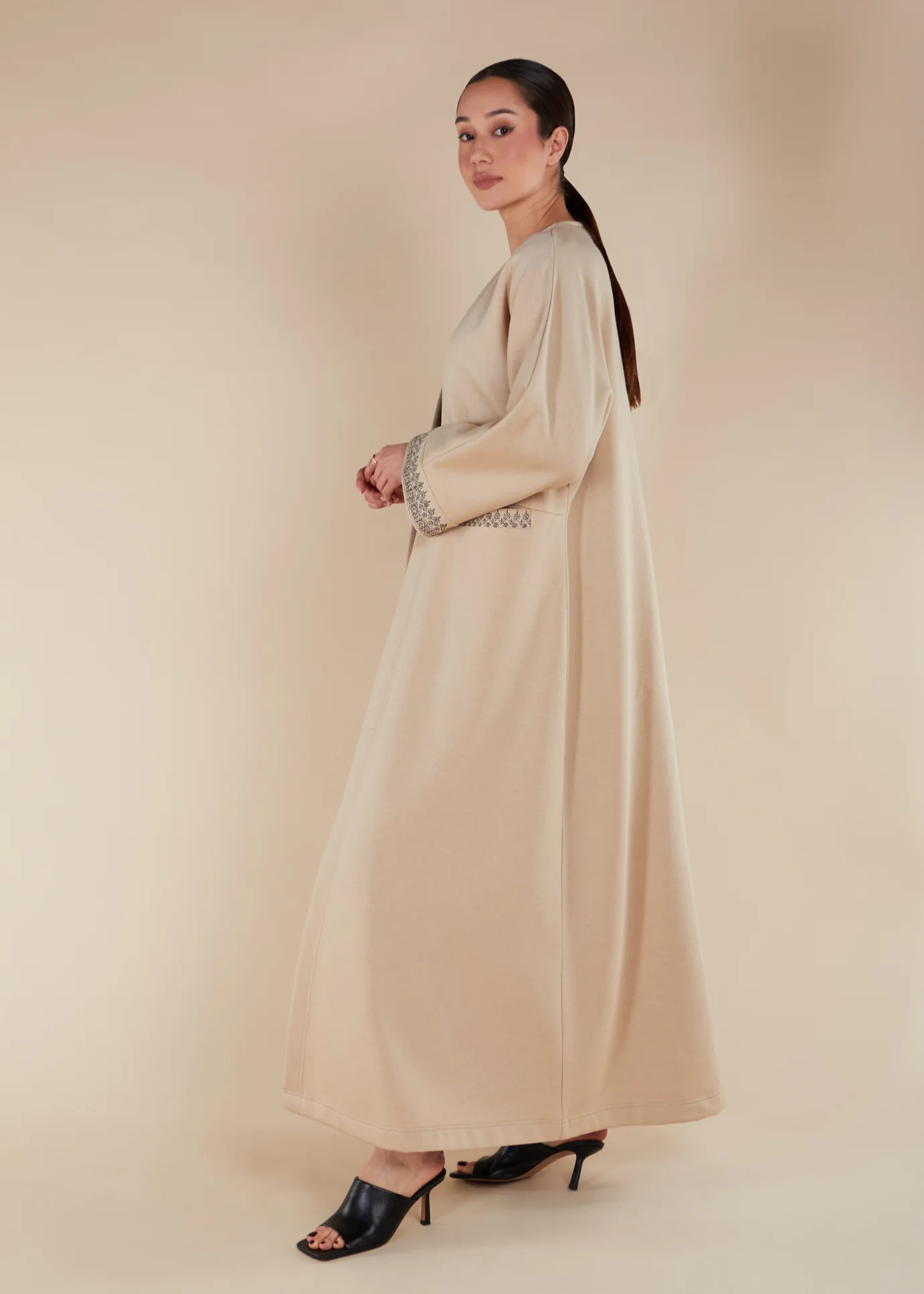 Enhance your spring wardrobe with this cosy fleece cover up. Featuring delicate embroidery on the cuffs, pockets, and belt, it's the perfect addition to your evening ensemble. Keep warm during cooler spring evenings with this loose-fitting cover up, ideal for tarawih and outings.