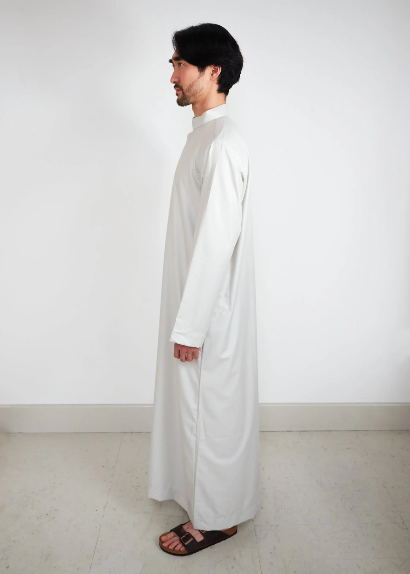 Classic Thobe available in four muted tones specially chosen by Aab, has a fluid look and feel - features side pockets and concealed buttons with a round collar.