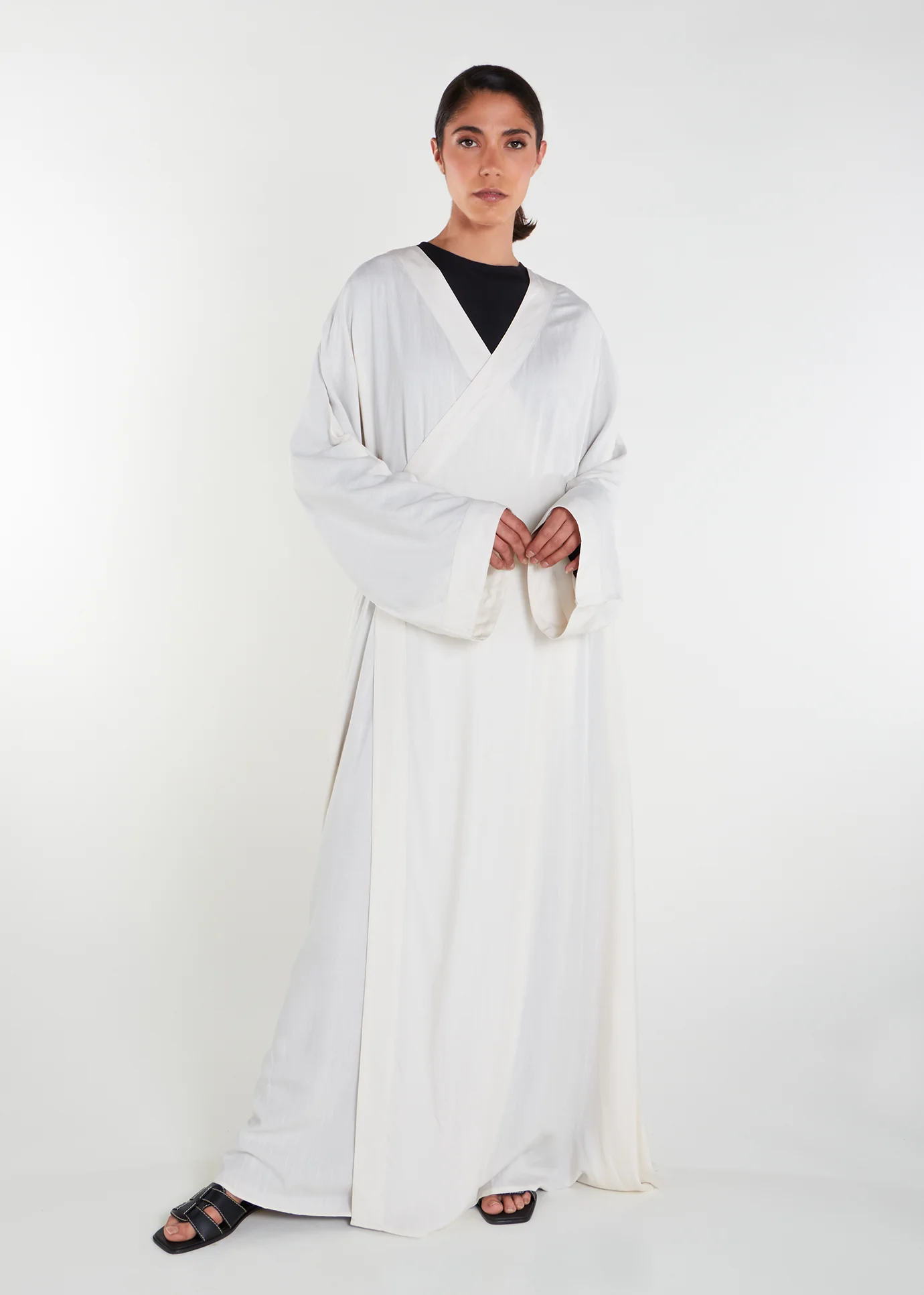 Transform your wardrobe with our white Linen Wrap Abaya, featuring a V-neck and flowy sleeves for a stylish and comfortable look.