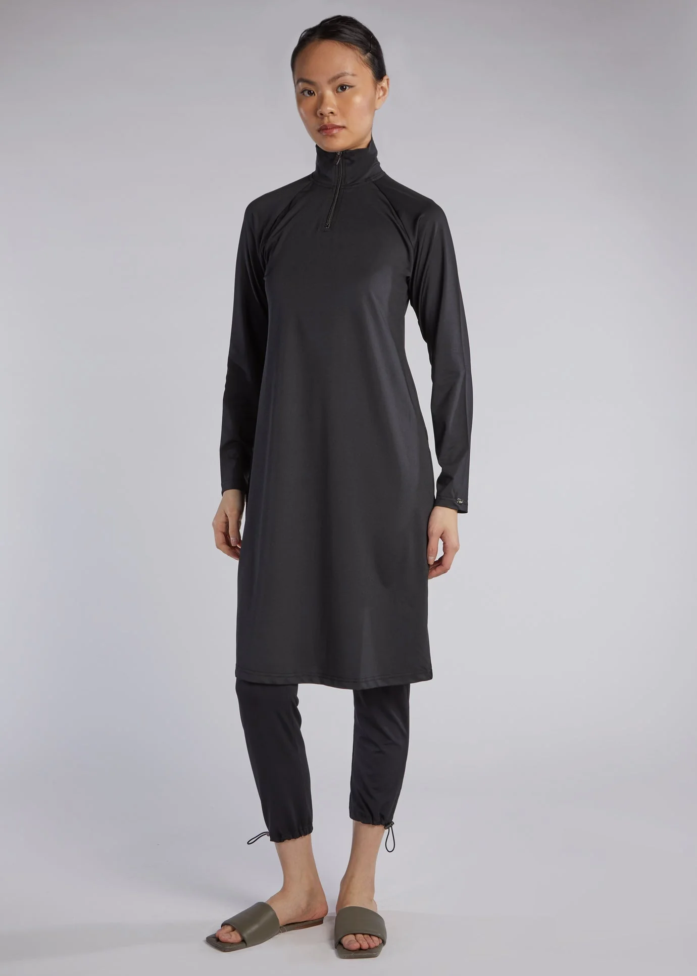 A perfect knee length modest swimwear top with long sleeves and a high neck line with a zip fastening for full coverage. A comfortable fit that stays put and a quick-drying fabric