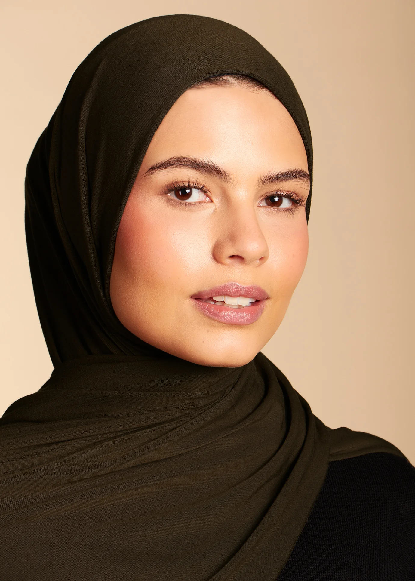 Effortless to style and incredibly comfortable to wear, with a subtle sheen. The medium-thick weight is soft, breathable, fully opaque and durable. Jersey works well in all climates, can be worn without an under scarf or pins, and makes a great option for working out.