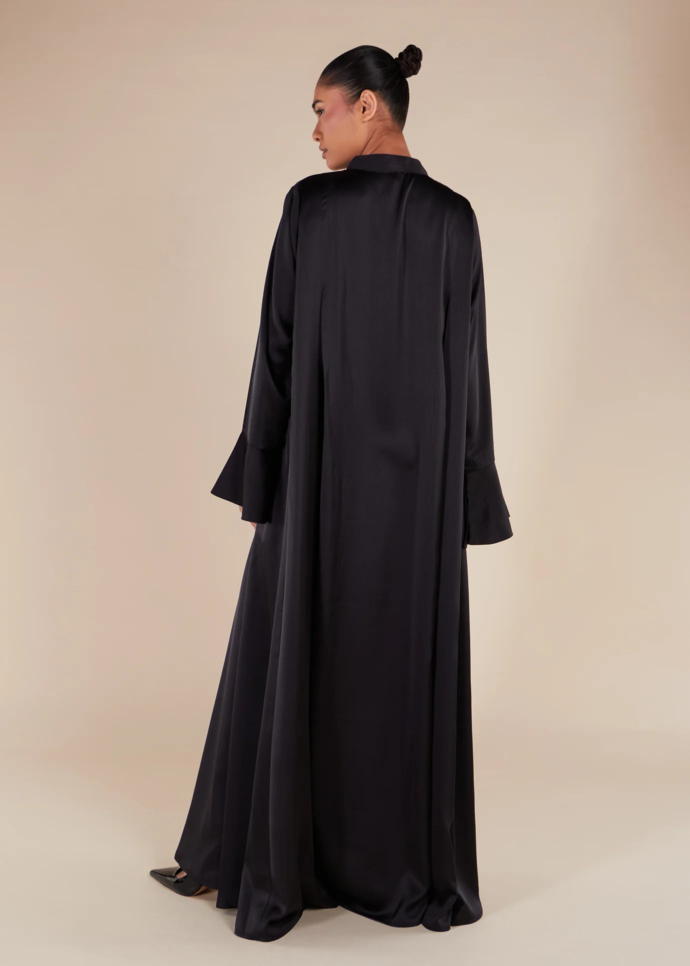 This is an elegant, full-length black satin abaya designed with a minimalist aesthetic. The high-neck collar, accented with functional fastening stitches, adds a touch of structure and detail. The relaxed fit and luxurious satin fabric offer comfort and sophistication for both everyday wear and formal occasions.