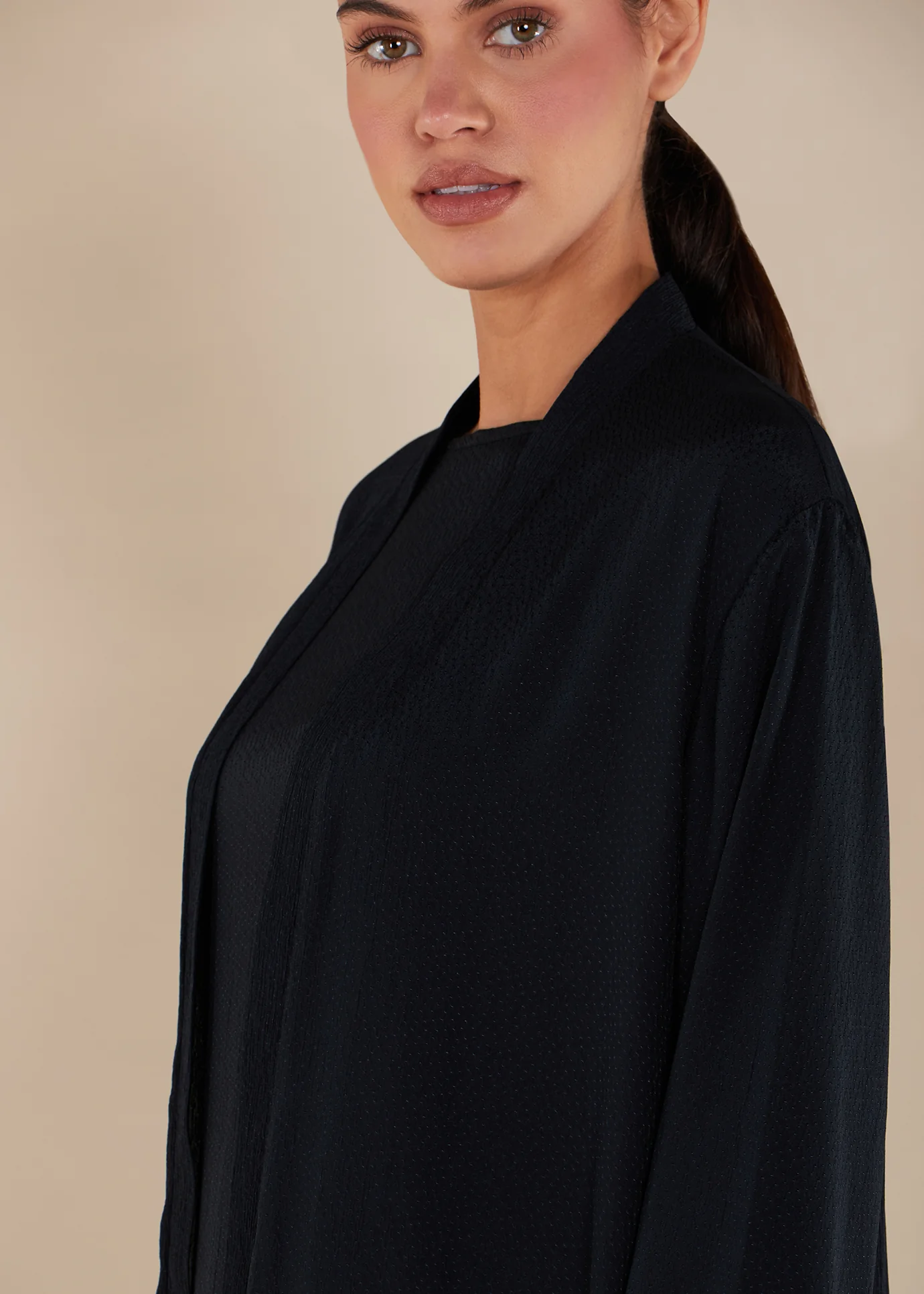 This self-print abaya has a silk-like texture and lightweight feel, allowing for a loose and modest fit. Enhance the look with the addition of a matching slip dress.