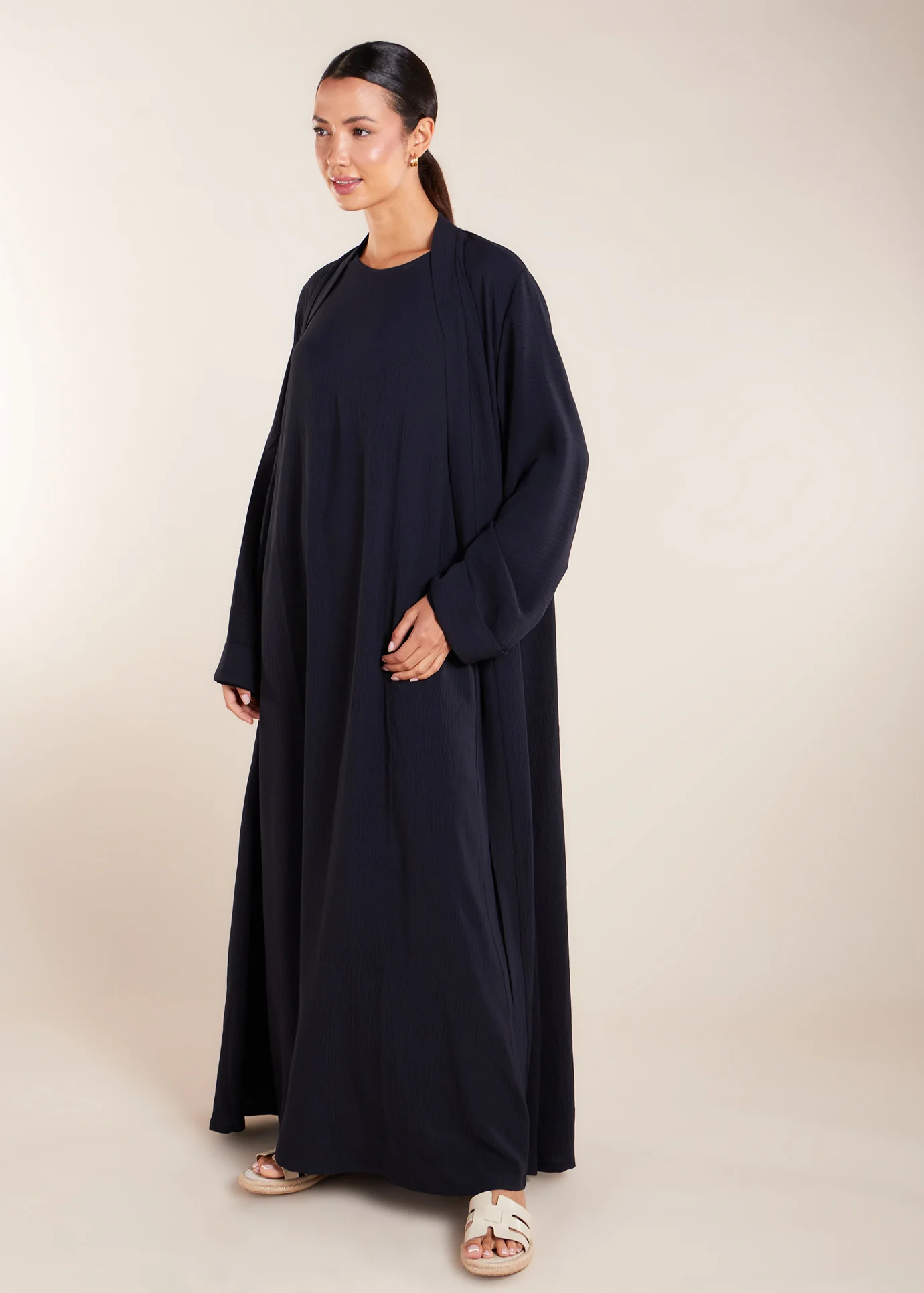 This elegant Two-Piece Open Abaya set includes a Full Sleeve matching slip. Perfect for everyday wear, it can also be dressed up with accessories for an evening look. The full sleeve slip dress can be worn as a maxi dress on its own or paired with the open abaya for a stylish ensemble.