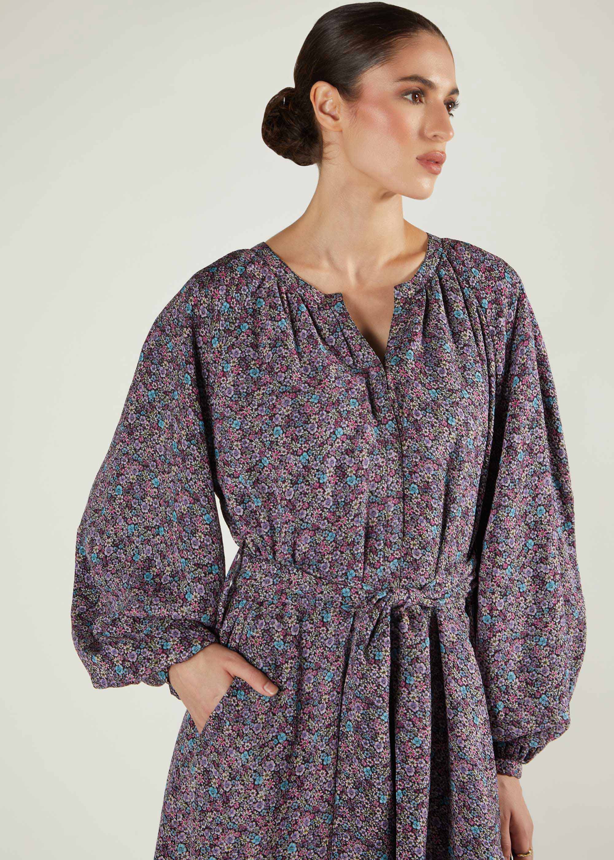 This fully lined maxi dress showcases a modest heart-shaped neckline with delicate pleating that extends to the shoulders. Its voluminous balloon sleeves enhance the sophisticated floral pattern in rich violet and mauve tones, accented with subtle blue hints. Included is a self-fabric belt, or you can choose to style it with your preferred belt. Wear it with heels for an elegant occasion or layer with long boots and a high-neck top for a stylish winter outfit.