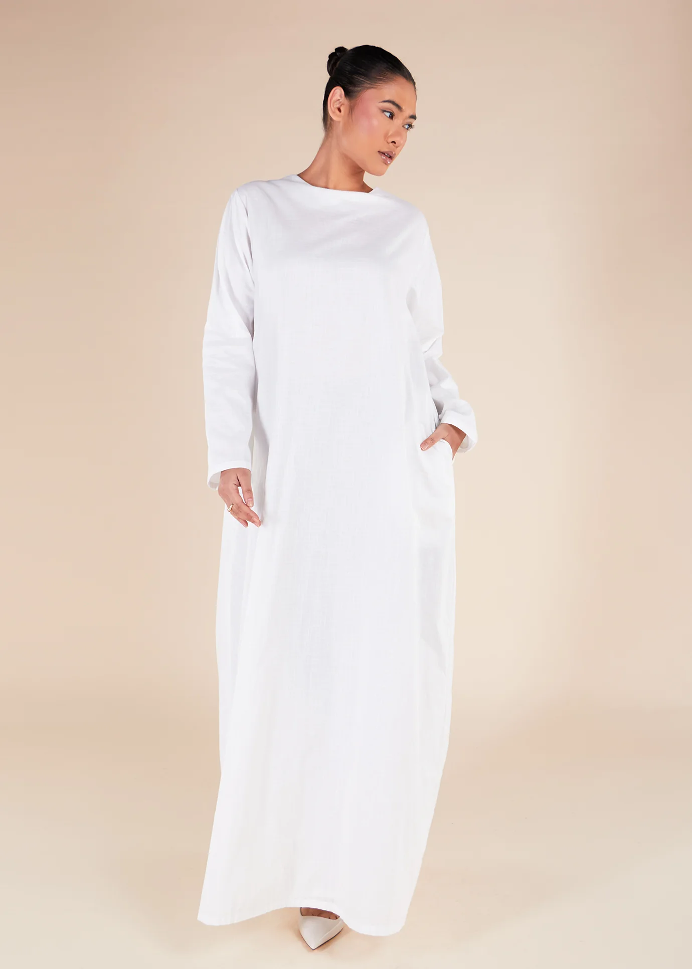Ideal for pairing with open abayas and kimonos, this fully lined white slip dress is a must-have addition to your wardrobe, has a linen look that exudes elegance.